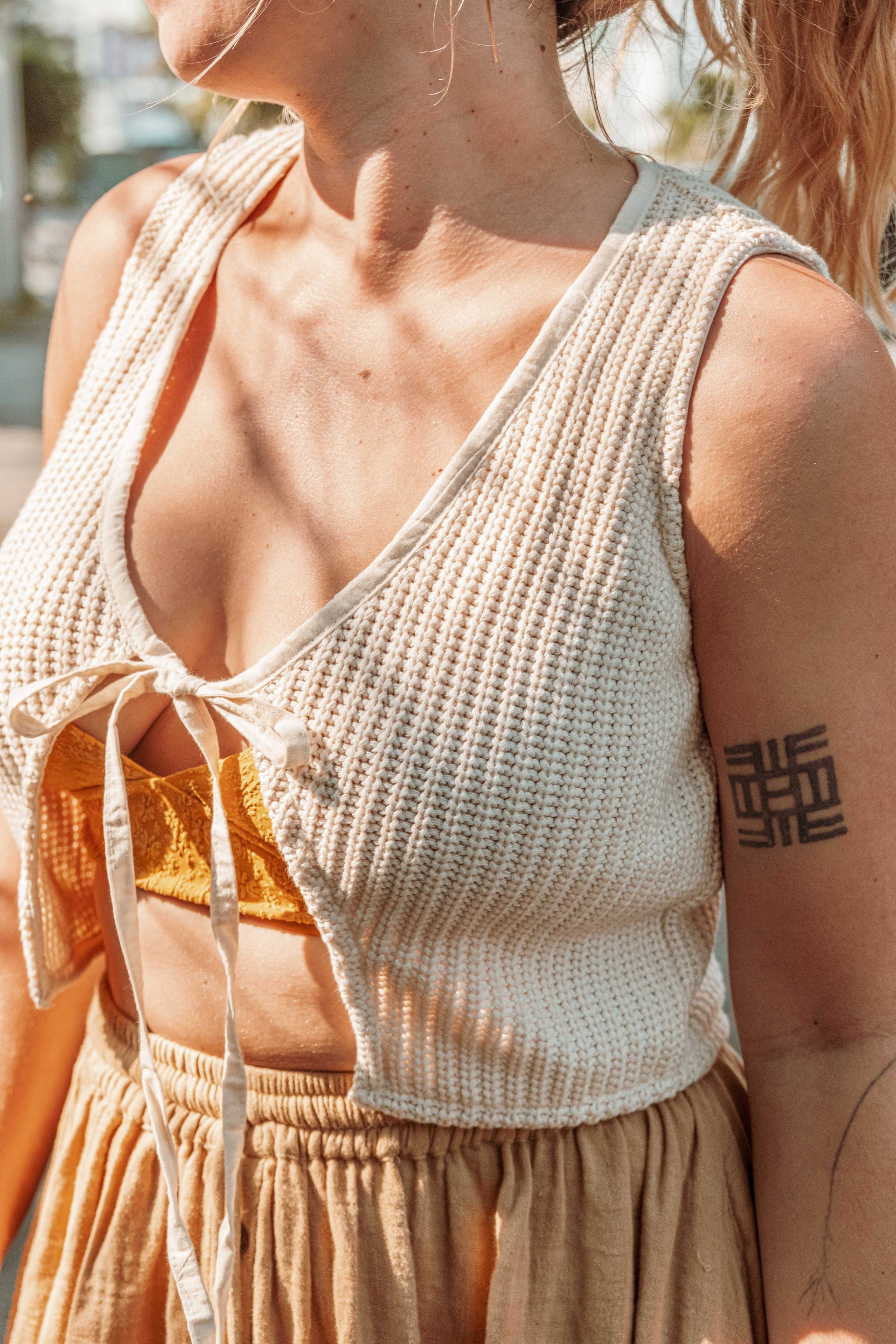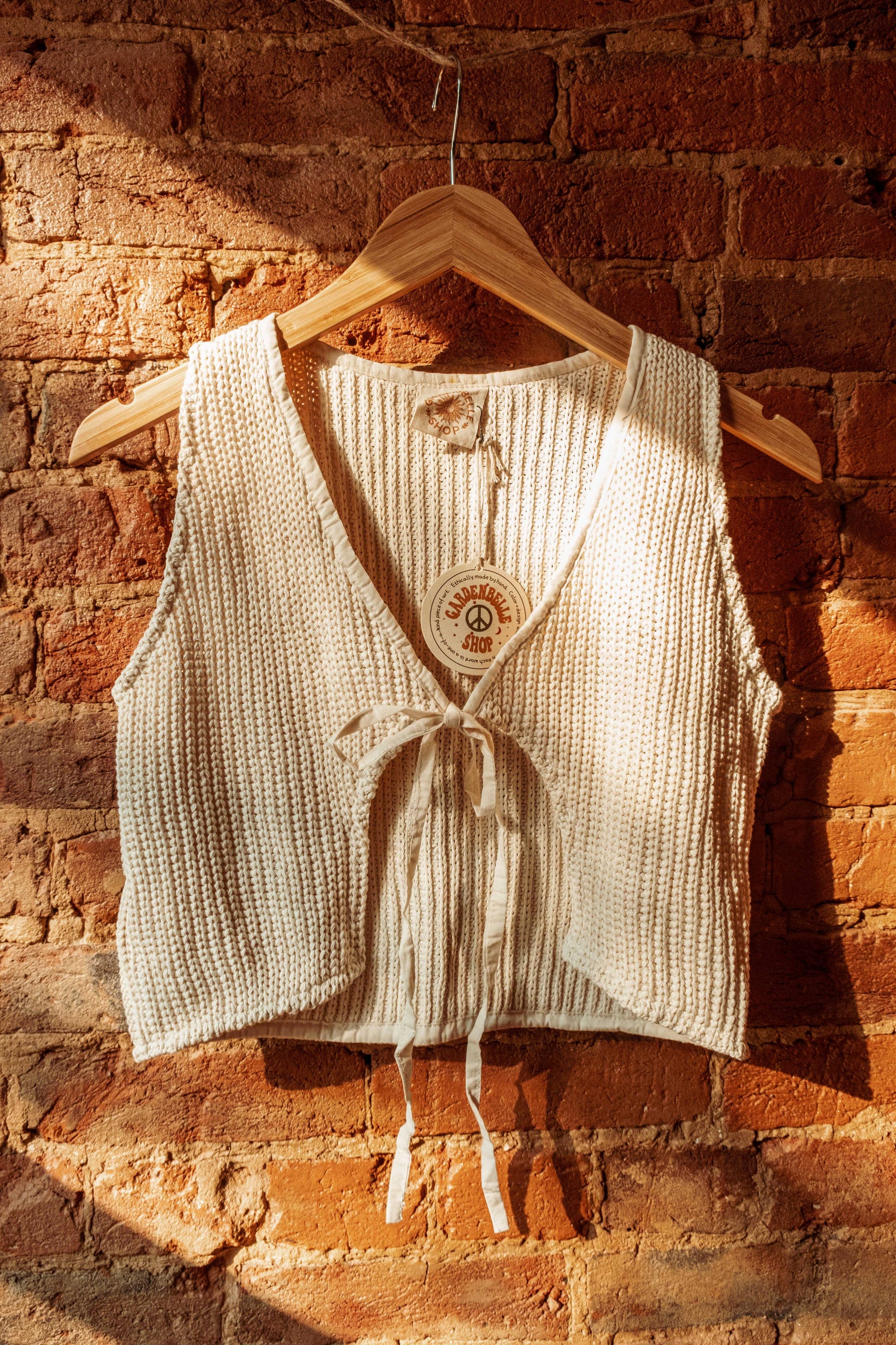 Sweet boho style knit vest, lovingly crafted from 100% GOTS certified organic unbleached cotton. This cropped vest from Gardenbelle Shop embraces a laid-back beachy vibe, offering a perfect lightweight layer without being too hot. Designed for the conscious fashionista, it beautifully embodies our commitment to sustainability and ethical fashion. Elevate your wardrobe with this versatile piece that's both stylish and comfortable, perfect for any casual outing or a sunlit stroll. Add a touch of organic charm to your sustainable wardrobe