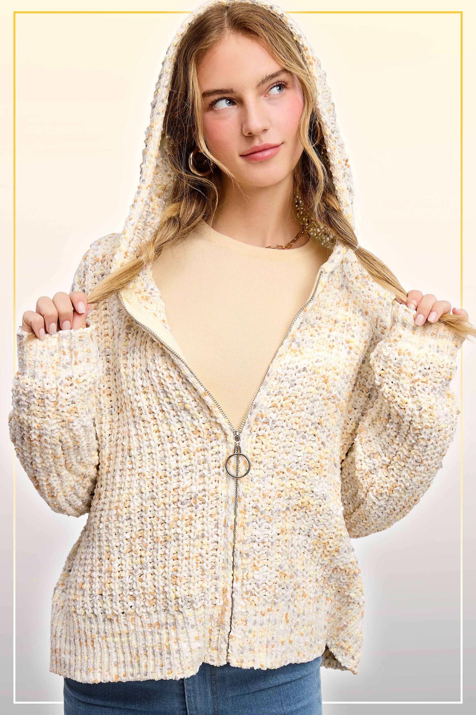 colorful style, confetti, hoodie sweater, pullover sweater, outerwear, cozy knit hoodie, long sleeve, zip up front, loose fit, layering piece, fall, Christmas sweater, holiday sweater