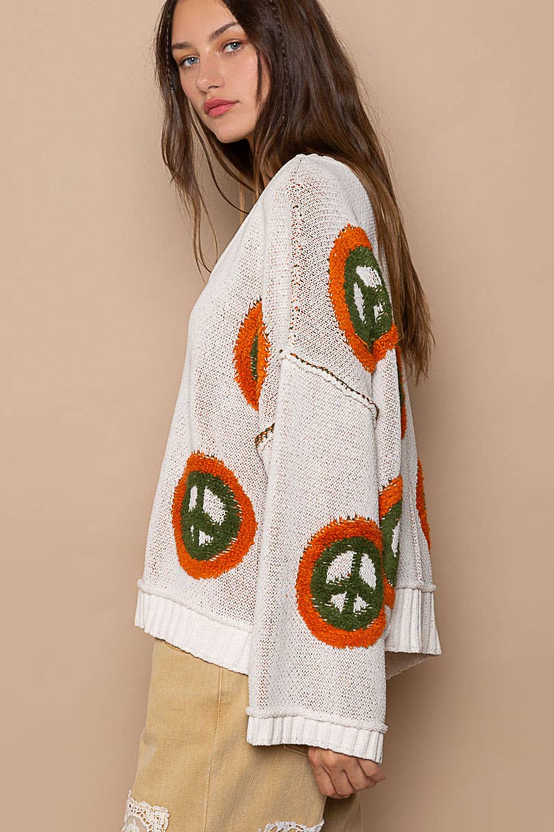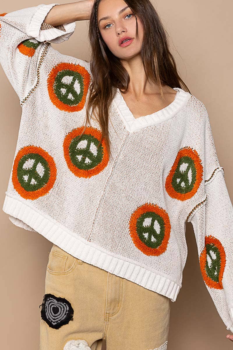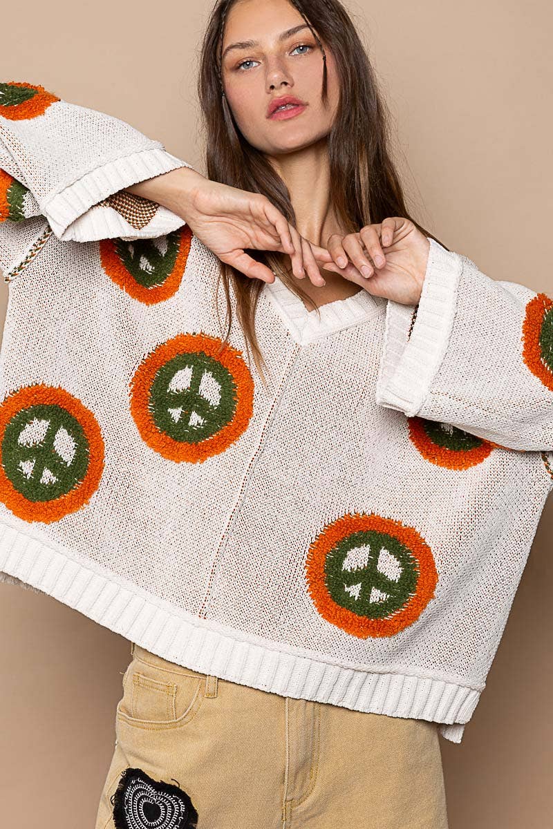 Designed in V-neck long sleeve relaxed fit sweater top in chenille with out seam, peace berber print, rib band point.